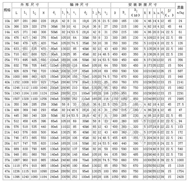 工作条件:输入转速28B型以下≤3000 r/min,40B型以下≤1800r/min,45B型以下≤1000r/min,Y型≤1500r/min;公称转矩2.107~588kN·m;传递功率0.25~2000kW;工作环境温度为-40~45℃,低于0℃时,启动前润滑油应预热,高于45℃时应采取降温措施。